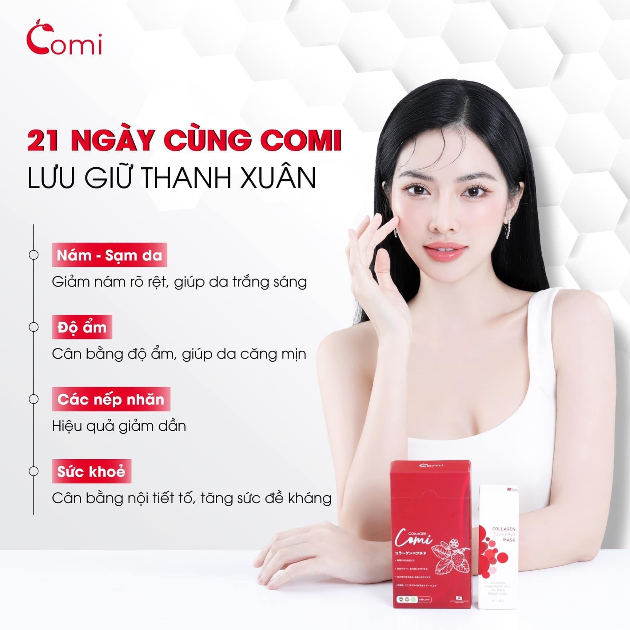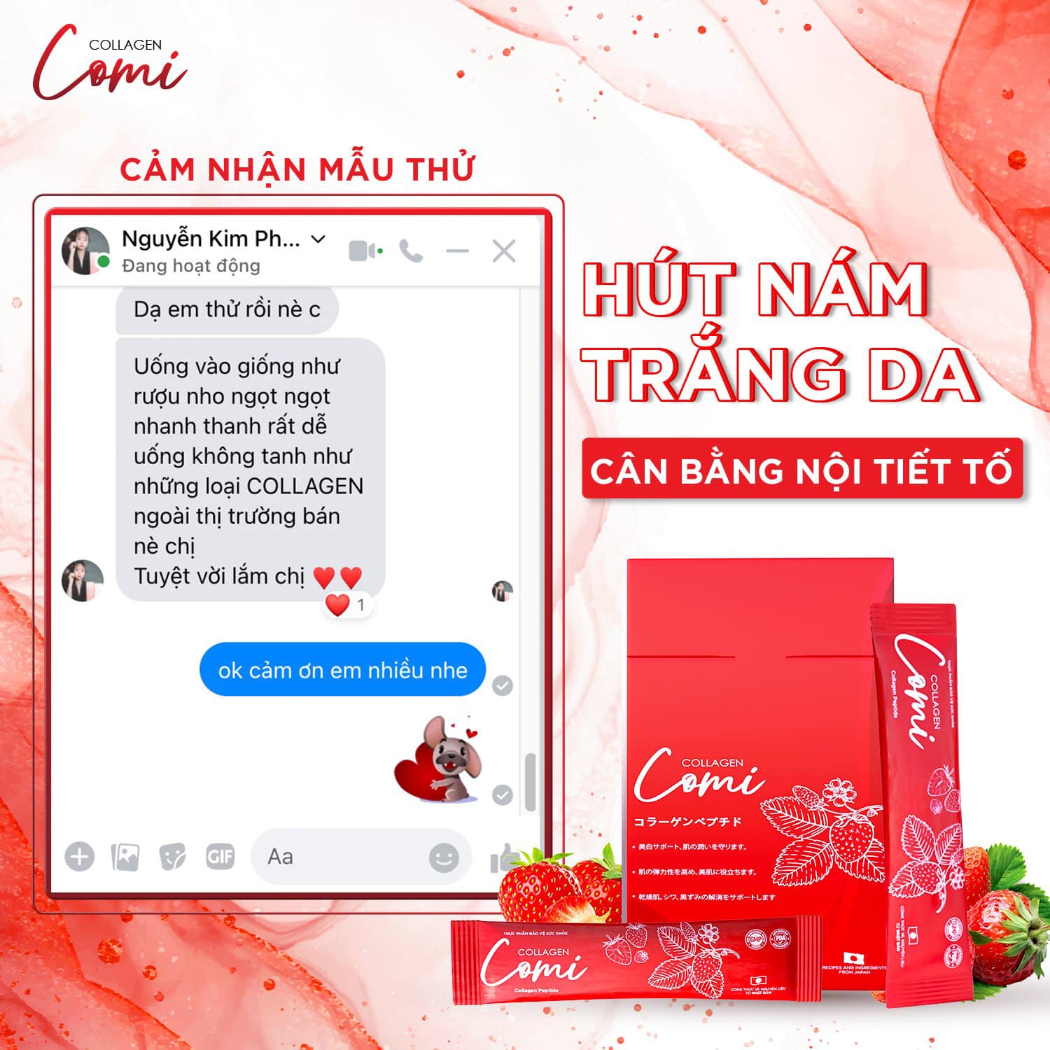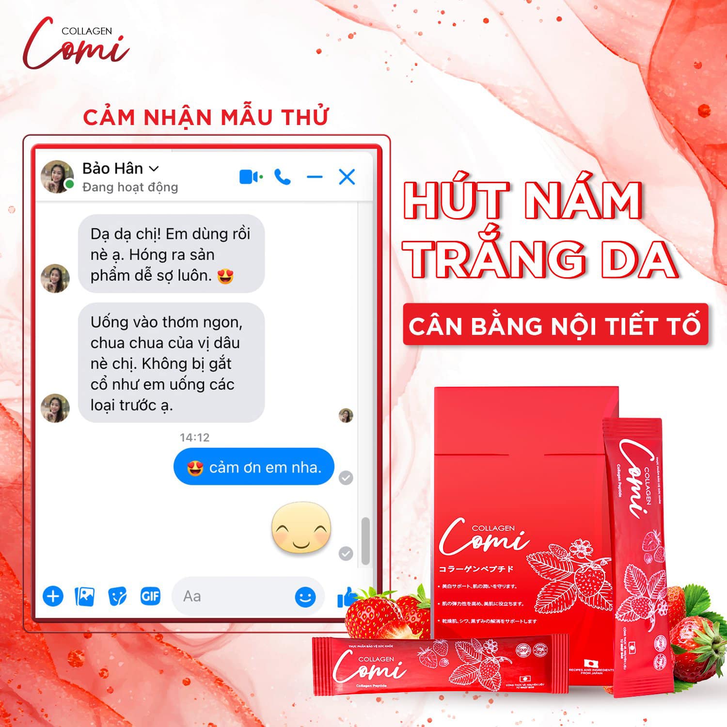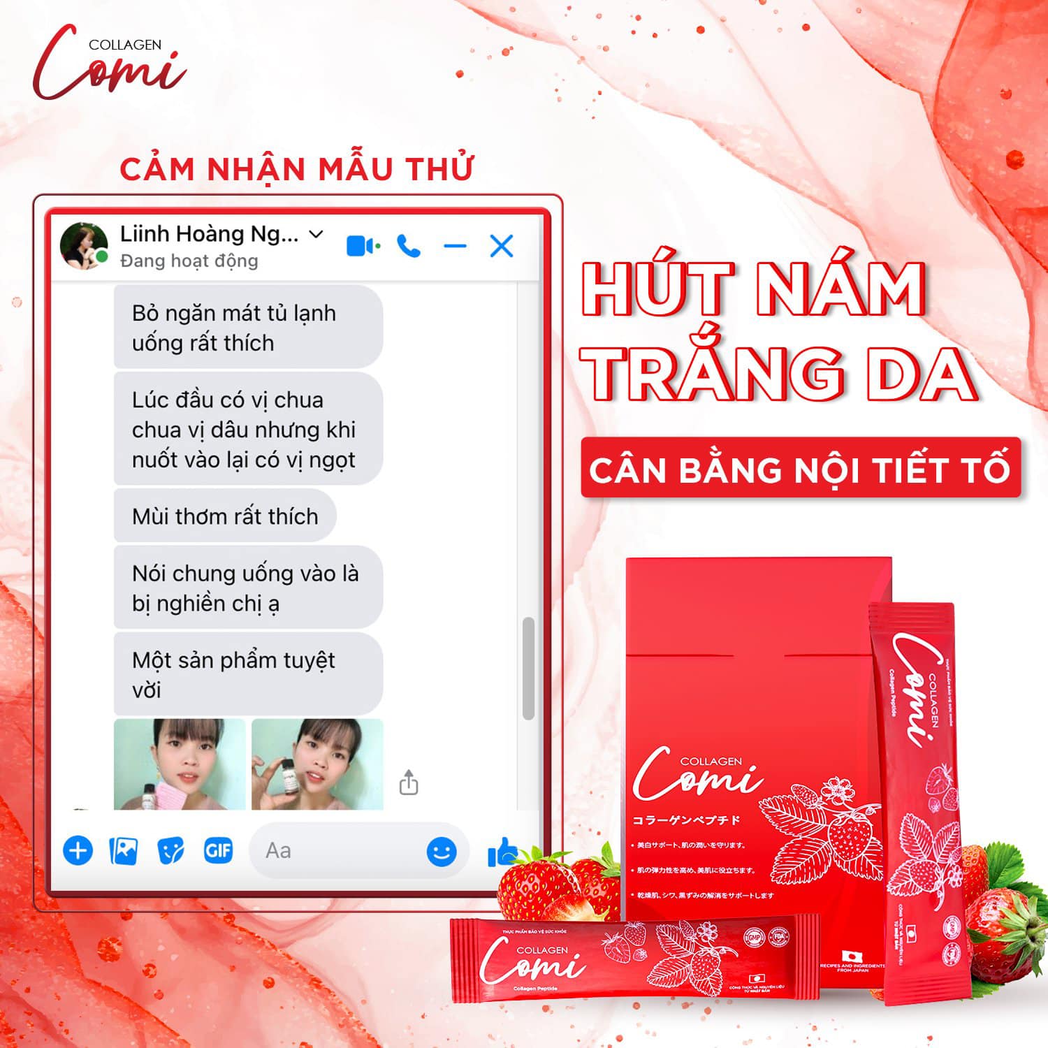 Diễn viên Phương Hằng chia sẻ sau 30 ngày sử dụng: "Trong Collagen Comi có Glutathion thành phần rất khó kết hợp, thế mà trong Comi kết hợp được chính vì thế Hằng rất thích. Sau 1 tháng sử dụng da Hằng căng hơn, rất thích. Và đặc biệt collagen dạng gói rất dễ mang đi du lịch, đi làm cực kì tiện lợi luôn".