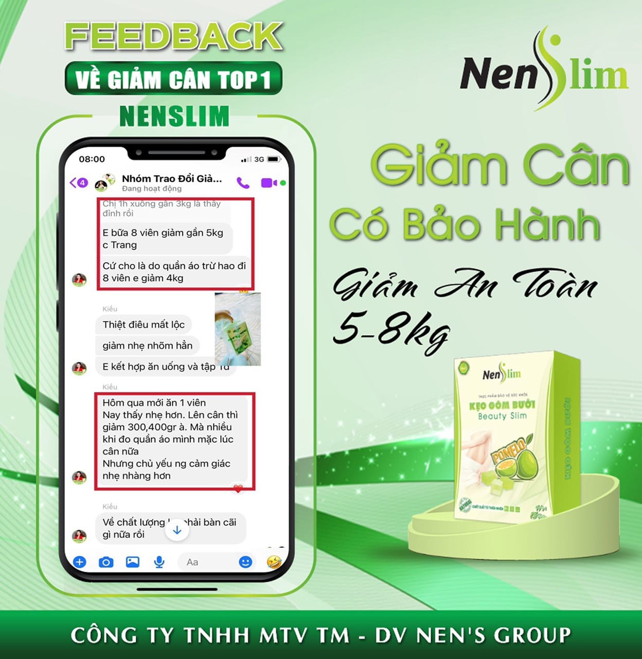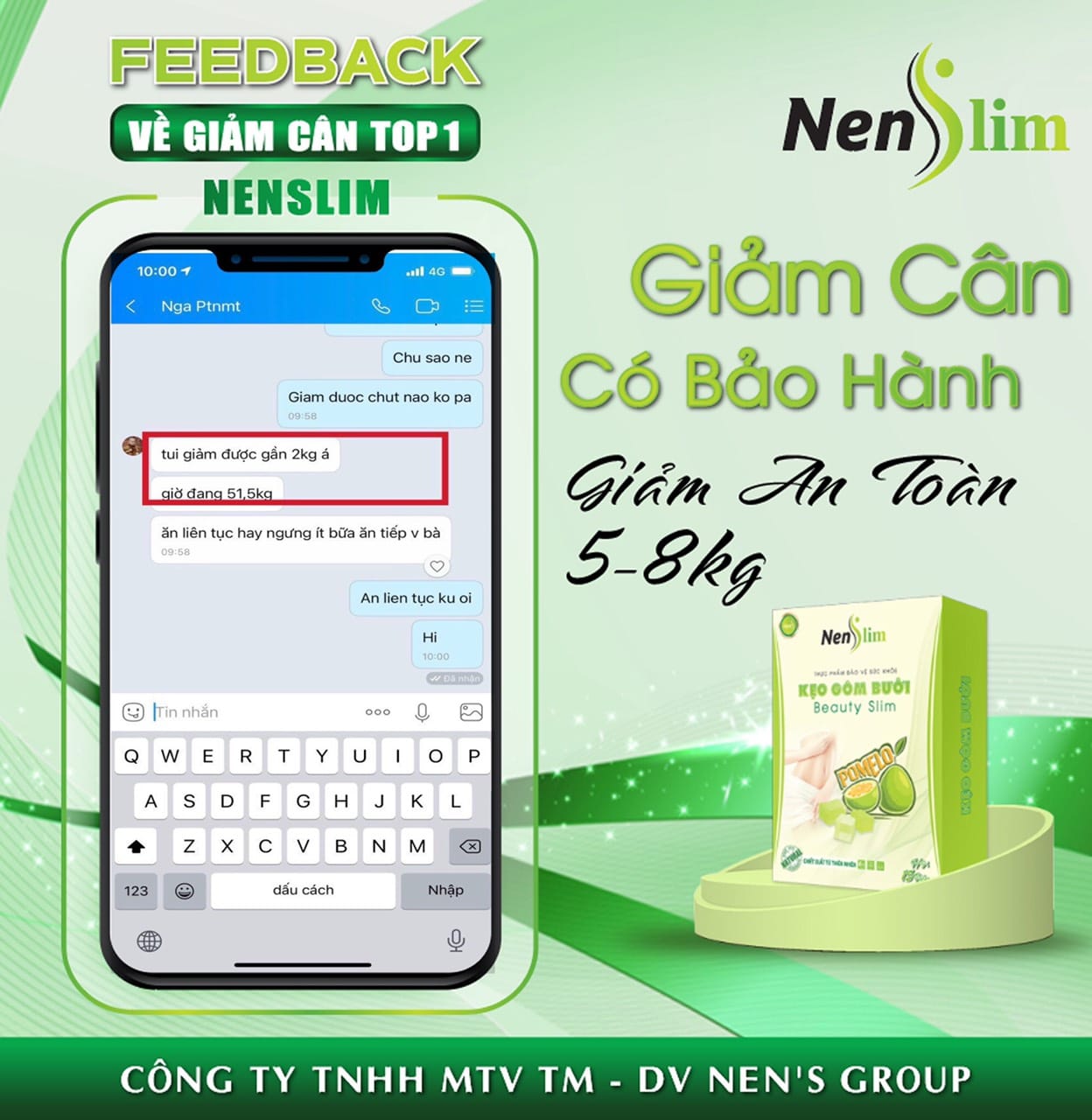 - Với mong muốn đem lại một sản phẩm giảm cân hiệu quả, an toàn cho những khách hàng có nhu cầu giảm cân nhưng không có nhiều thời gian tập luyện. Đội ngũ của Nen’s đã nghiên cứu và cho ra đời Kẹo gôm bưởi Beauty Slim đáp ứng được nhu cầu giảm cân. Nếu khách hàng đồng hành thì chúng tôi sẽ cam kết giúp khách hàng giảm ngay số cân mong muốn.