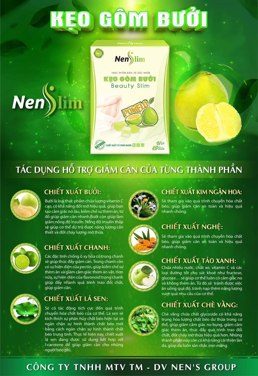 Review kẹo gôm bưởi giảm cân Nenslim Với những thành phần tự nhiên của mình, Kẹo gôm bưởi Beauty Slim đã gây được ấn tượng trong tâm trí người sử dụng. Kèm theo đó là hiệu suất giảm cân hiệu quả ngoài mong đợi làm cho sản phẩm này trở thành loại kẹo giảm cân được tin dùng nhất năm 2022.