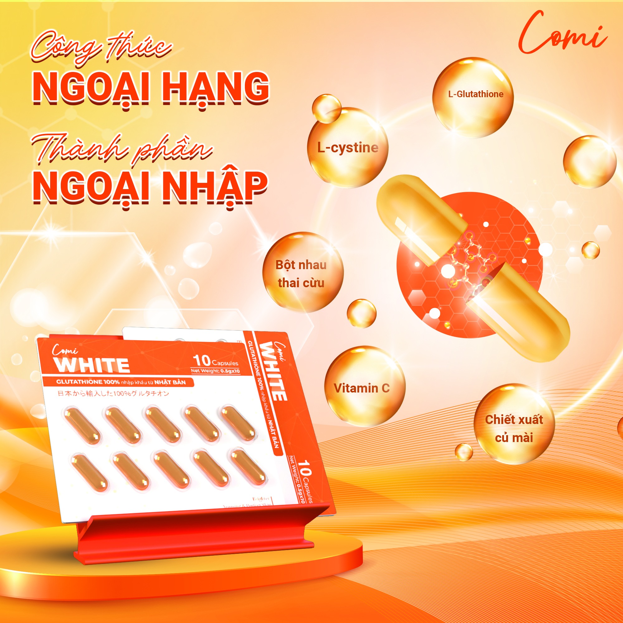 Viên uống trắng da Comi White thành phần gồm Glutathion, Lcystine, nhau thai cừu, Vitamin C, Củ mài, Thiên môn chùm, Comi White giúp da trắng sáng toàn thân, chống lão hóa giảm thâm mụn, chống nắng nội sinh, cân bằng nội tiết tố, tăng cường sức đề kháng.