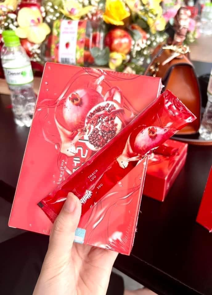 Thành phần chính thạch lựu gồm: Nước ép lựu, Nước, Đường, Chitosan, Collagen...