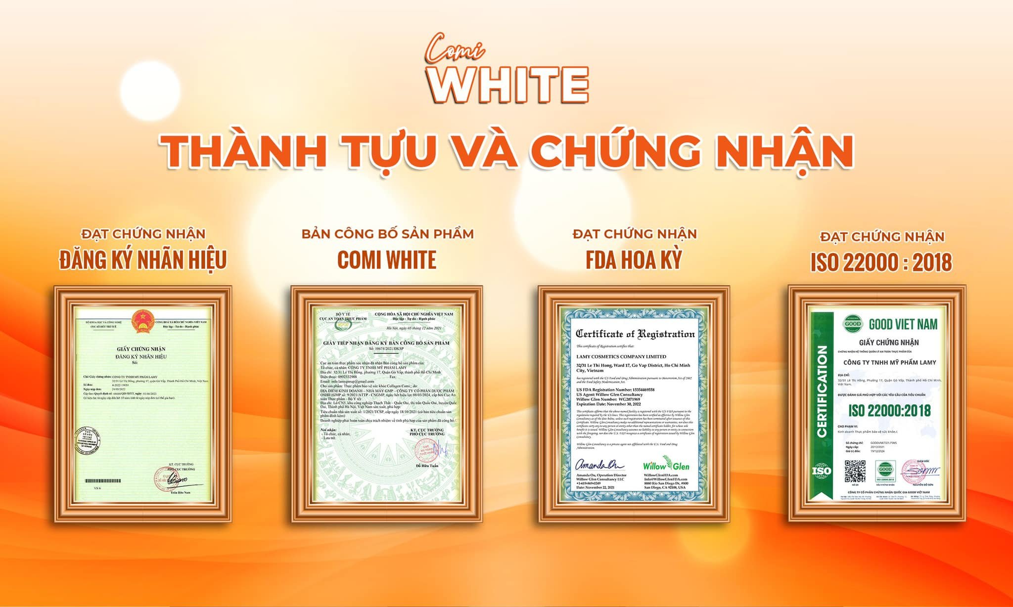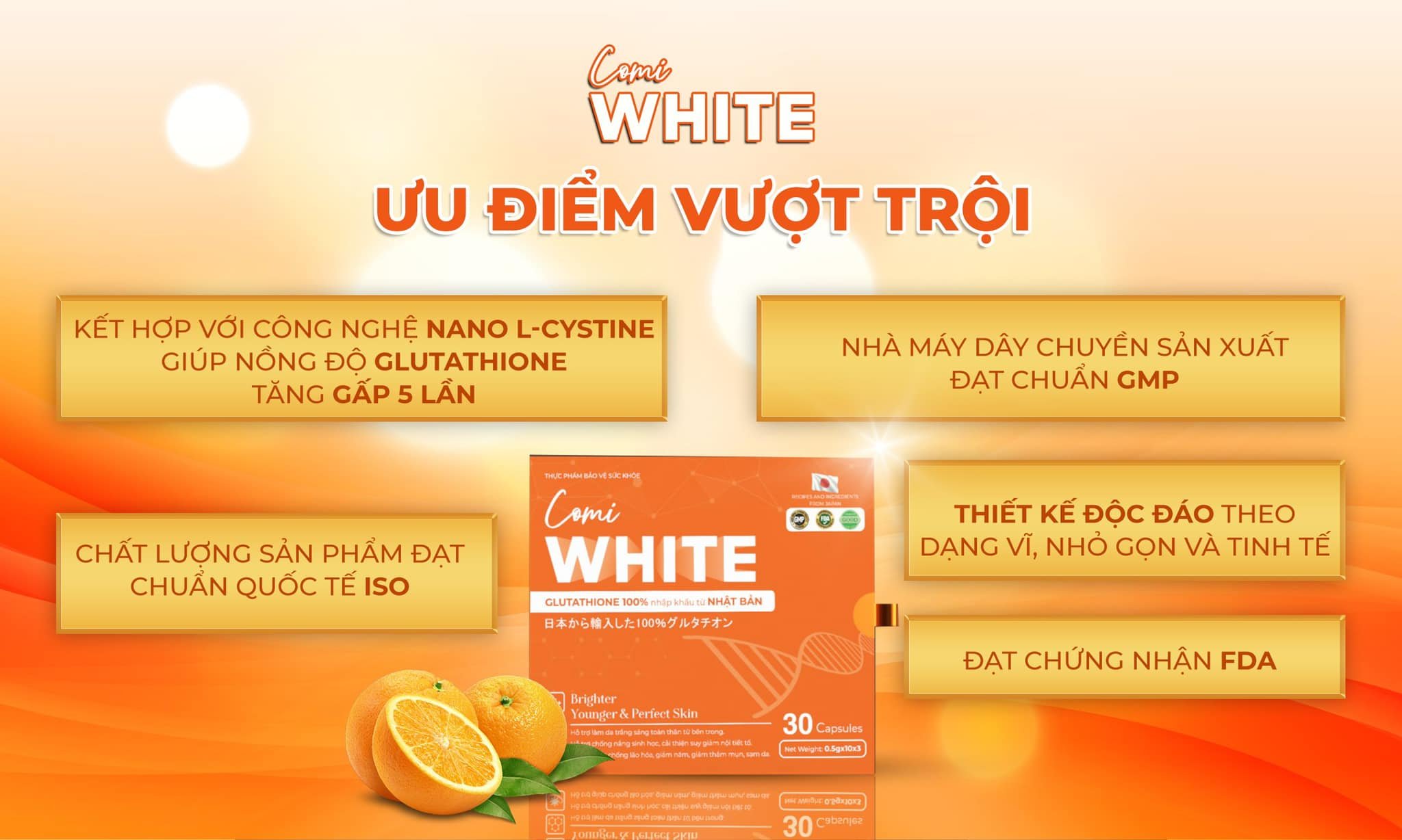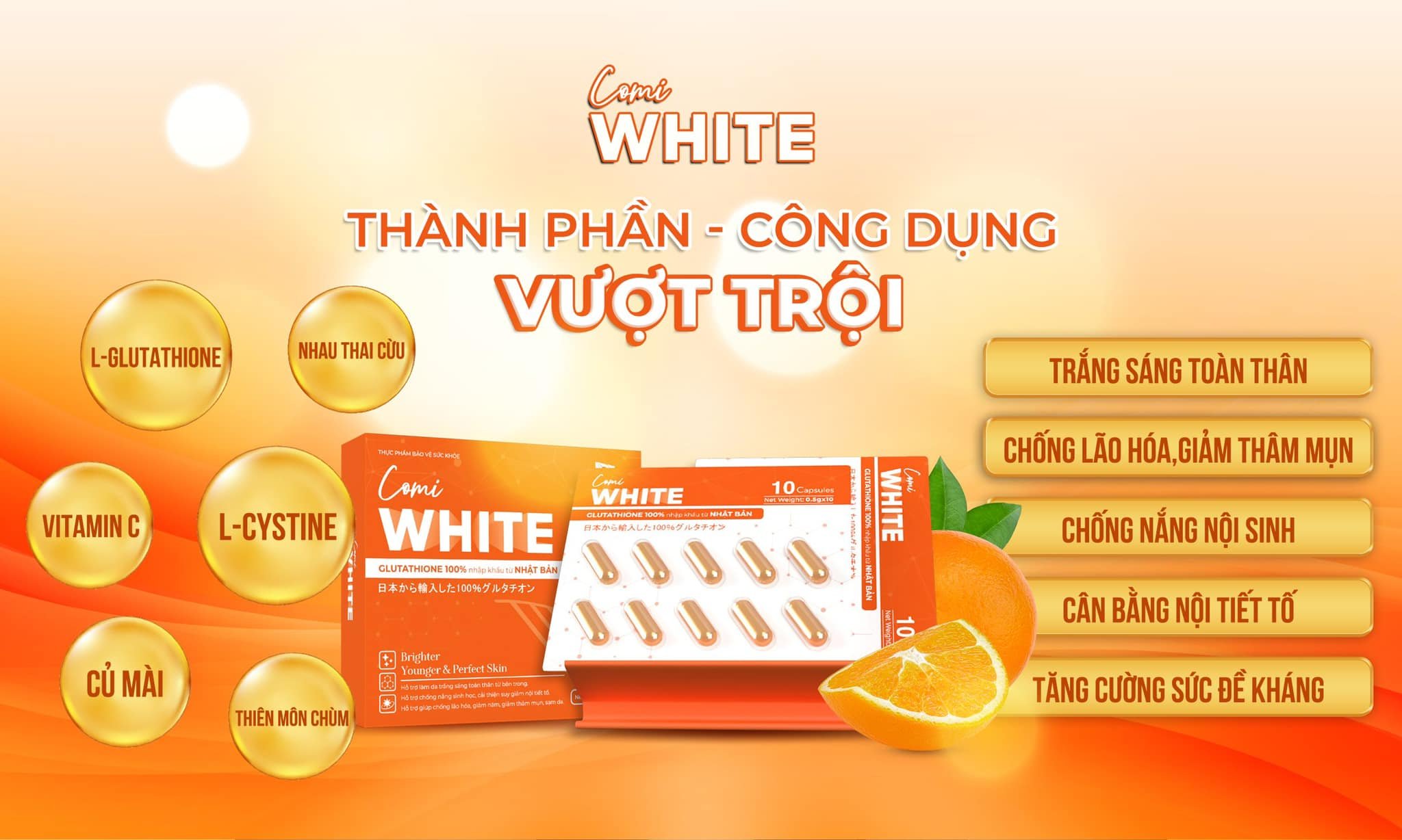Với Glutathion, Lcystine, nhau thai cừu, Vitamin C, Củ mài, Thiên môn chùm, Comi White giúp da trắng sáng toàn thân, chống lão hóa giảm thâm mụn, chống nắng nội sinh, cân bằng nội tiết tố, tăng cường sức đề kháng.