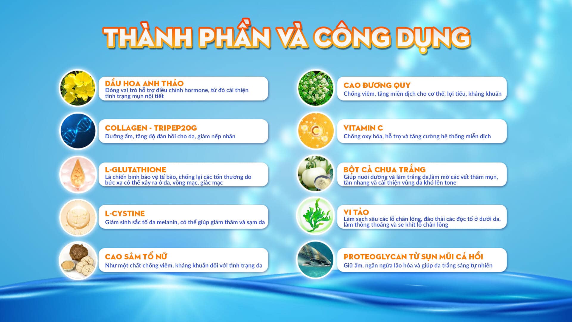 Collagen – Tripep20G: Dưỡng ẩm và tăng độ đàn hồi cho da, giúp giảm nếp nhăn.