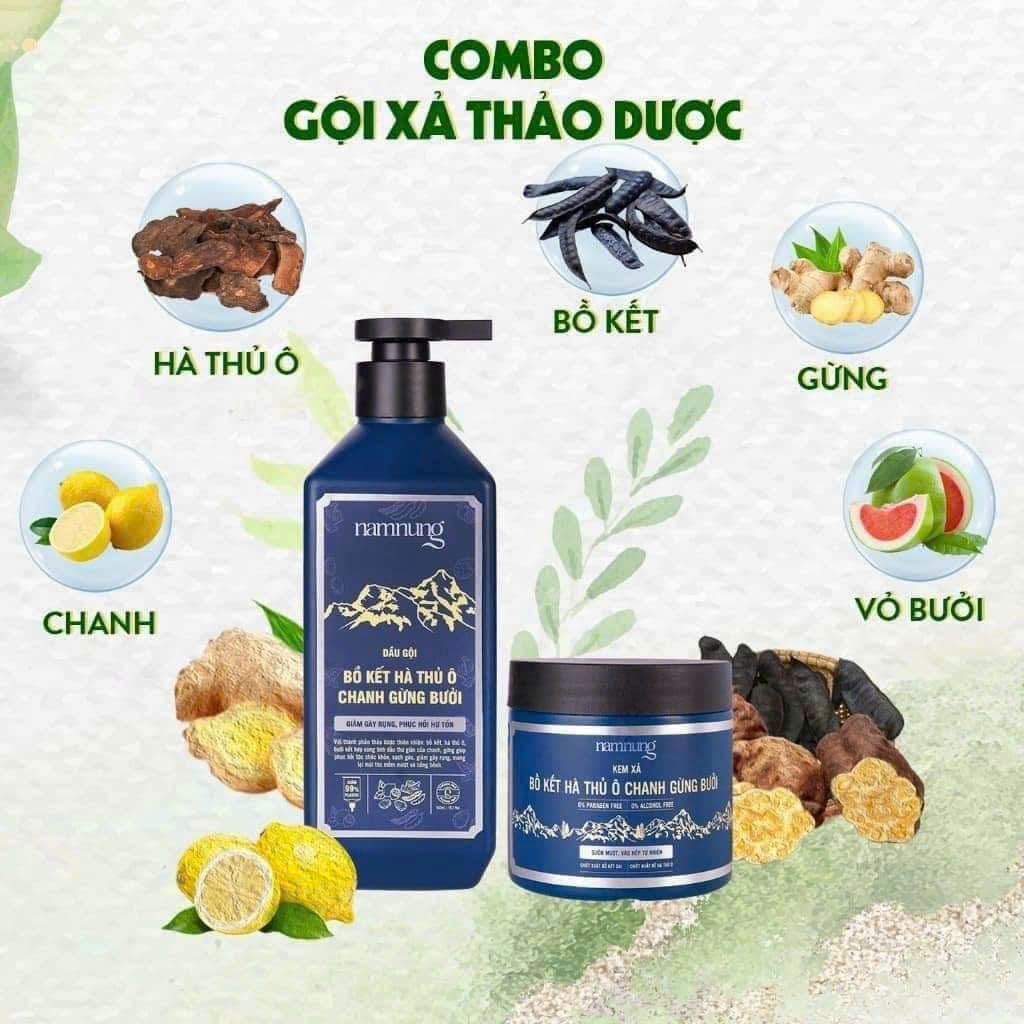 Bộ dầu gội xả thảo dược NamNung chiết xuất đậm đặc từ bồ kết, hà thủ ô, chanh, gừng và thảo dược truyền thống không Sulfate, Silicone, Paraben, cùng các hoạt chất thiên nhiên giúp làm sạch tóc và da đầu, ngăn và cải thiện tình trạng tóc gàu, gãy rụng, chẻ ngọn.. cho mái tóc mềm mượt chắc khoẻ, góp phần kích thích sự phát triển của nang tóc.