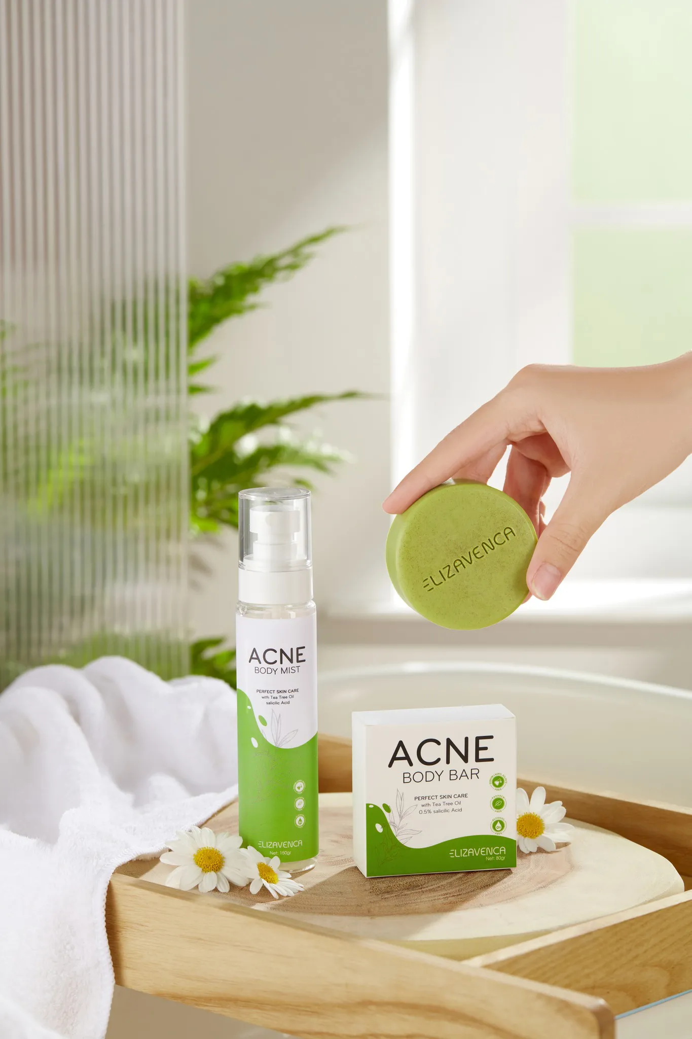 • Bước 3 (sau khi lau khô vùng da): Xịt Acne Body Mist lên vùng da có mụn/thâm. “Sau khi tắm và lau khô, xịt lên vùng da có mụn và vết thâm khoảng 2-5 lần rồi vỗ nhẹ để tinh chất thấm sâu vào da”.