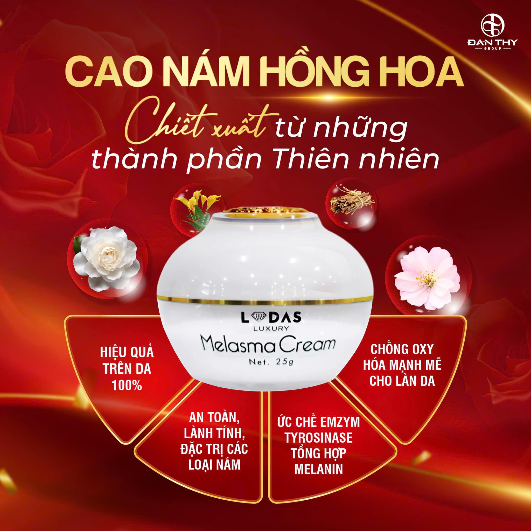 Cao Nám Hồng Hoa Lodas Melasma Cream Đan Thy giúp loại bỏ thâm - nám - tàn nhang sau 2-4 tuần sử dụng, dưỡng trắng nâng tone da, chống lão hóa, phục hồi và cấp ẩm cho làn da. Chị em nào mới bắt đầu xuất hiện nám trên da, hoặc đã bị nám lâu năm thì đều có thể sử dụng được Cao Nám hồng hoa Đan Thy nhé.