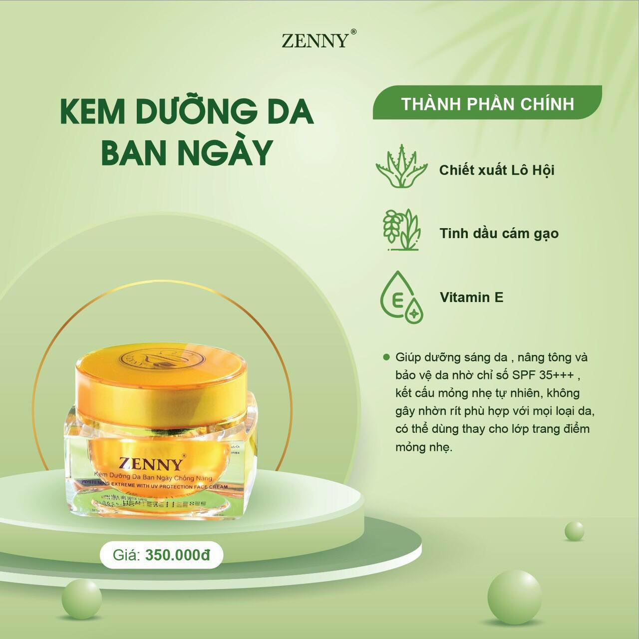 Kem Zenny là dòng mỹ phẩm dưỡng da chuyên dùng cho nữ giới. Kem phù hợp cho các chị em có làn da khô, sạm màu, xuất hiện nám, có mụn. Các chị em mong muốn cải thiện làn da sáng đẹp hơn, trắng hơn.