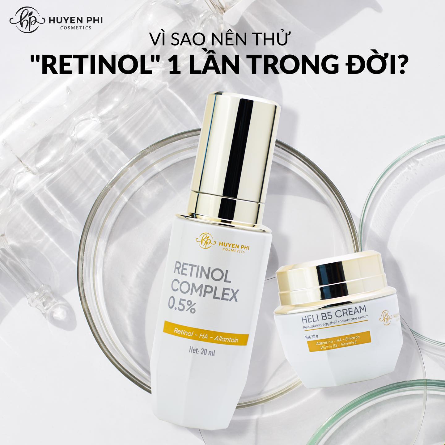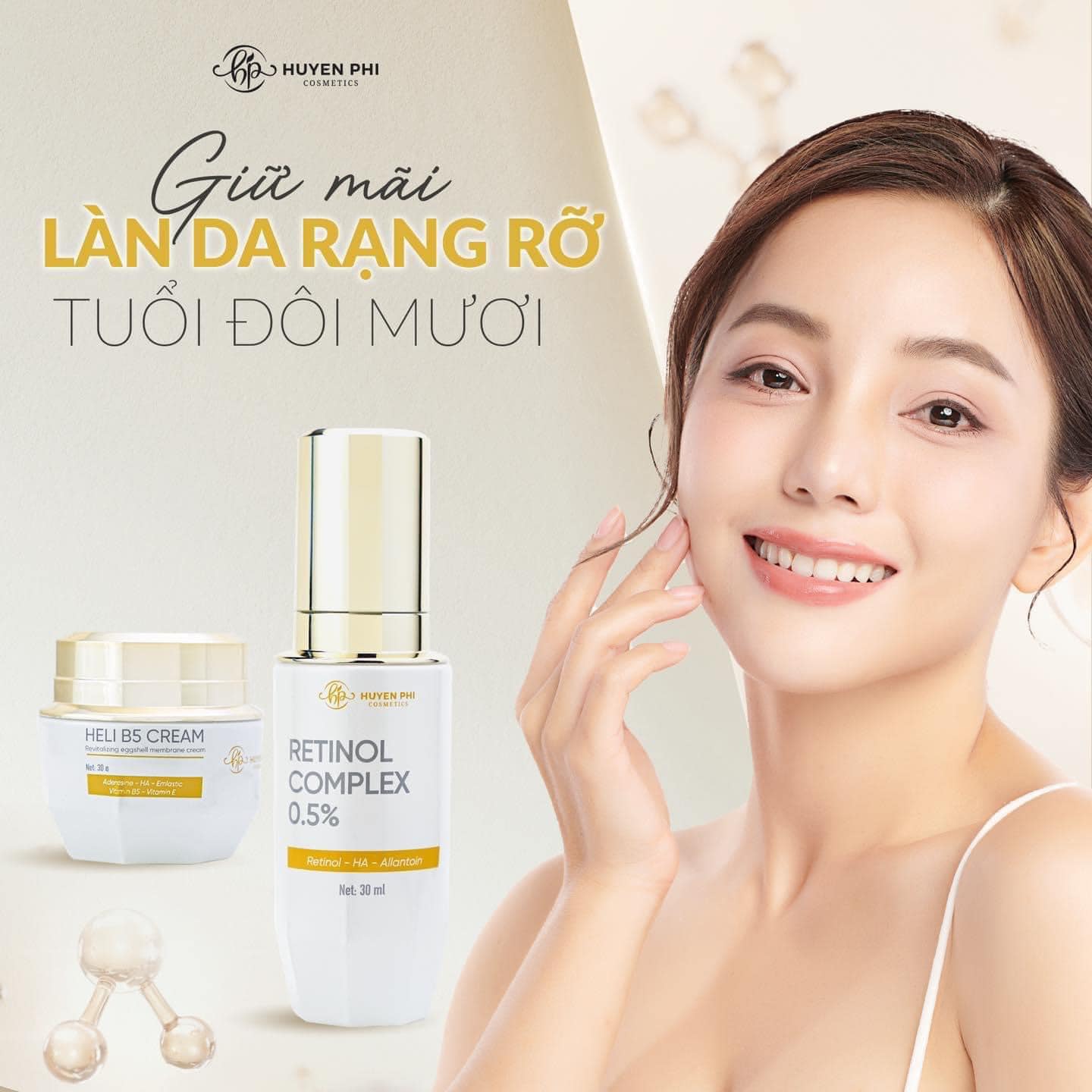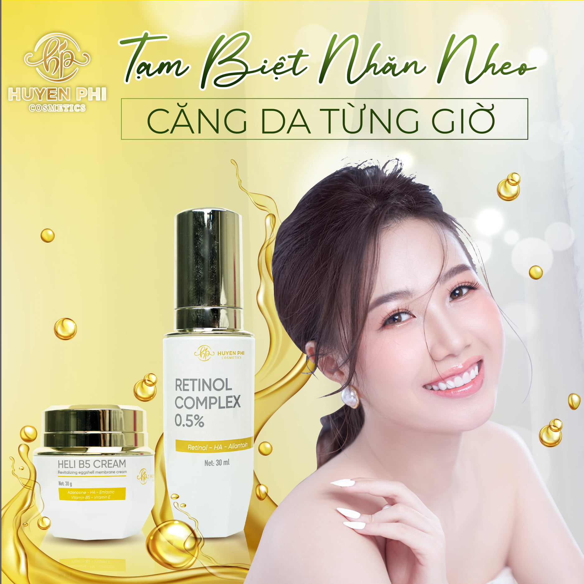 Với mong muốn mang đến một giải pháp cho những ai gặp tình trạng da xấu, xỉn màu, lão hóa và đang bị mụn. Huyền Phi chính thức cho da mắt dòng sản phẩm Retinol Complex 0,5% là một dẫn xuất vitamin A, thuộc nhóm Retinoids tự nhiên sẽ gây ít tình trạng kích ứng mẩn đỏ. Nồng độ 0.5% giúp giải quyết các vấn đề mụn ẩn, mụn viêm, kiểm soát bã nhờn, chiết xuất từ tảo biển giúp làm trắng da, giảm thâm nám và cùng với HA giúp cấp và giữ nước, Vitamin E giúp ngăn ngừa lão hóa. Kết hợp với Kem dưỡng phục hồi Heli B5 Cream khi sử dụng Retinol Complex 0,5% là sự kết hợp hoàn hảo giúp phục hồi cho da tổn thương, giảm thiểu kích ứng. Với kết cấu mỏng nhẹ thấm nhanh cùng các hoạt chất HA, tảo biển, vitamin B5, vitamin E mang lại hiệu quả cấp ẩm sau, phục hồi đa tầng, đẩy nhanh quá quá trình tái tạo và trẻ hóa da.