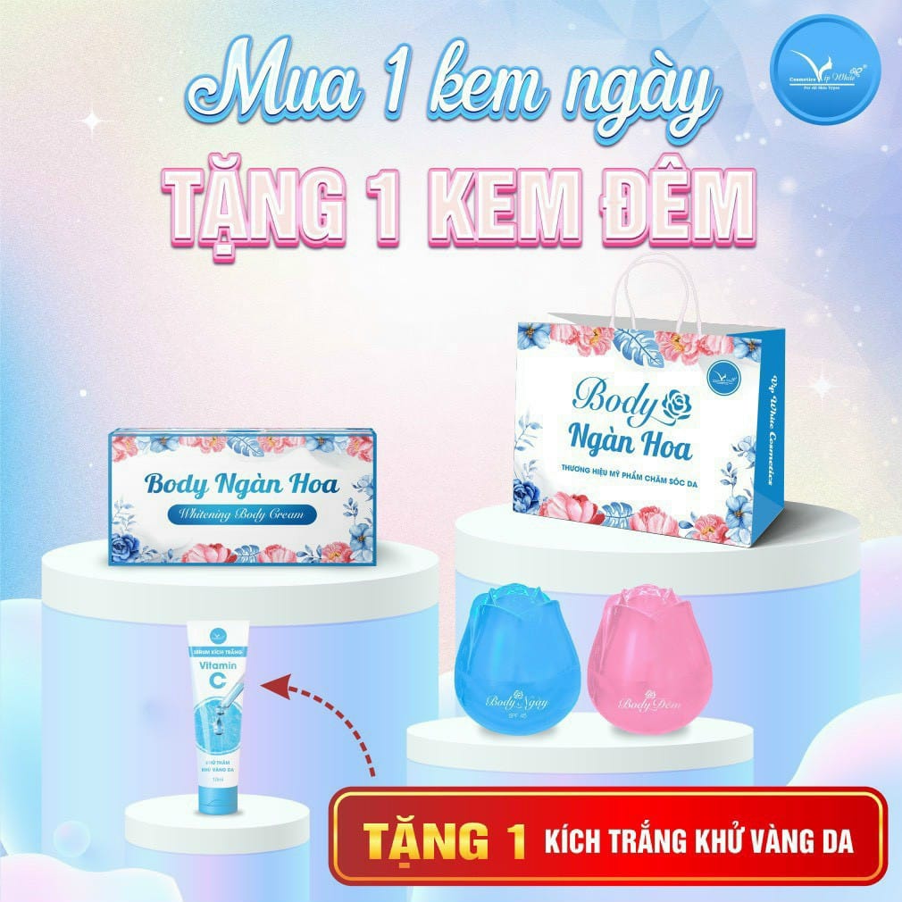 Kem Body Ngàn Hoa Vip White – Là loại kem dưỡng thể trắng da đặc biệt có tác dụng kháng khuẩn, loại bỏ tế bào da chết, đánh bật các sạm nám, tàn nhang trên da, dưỡng trắng da tự nhiên, đều màu. Hiệu quả nhanh chóng, lâu dài chỉ sau một thời gian ngắn sử dụng, đang được rất nhiều chị em yêu thích sử dụng.