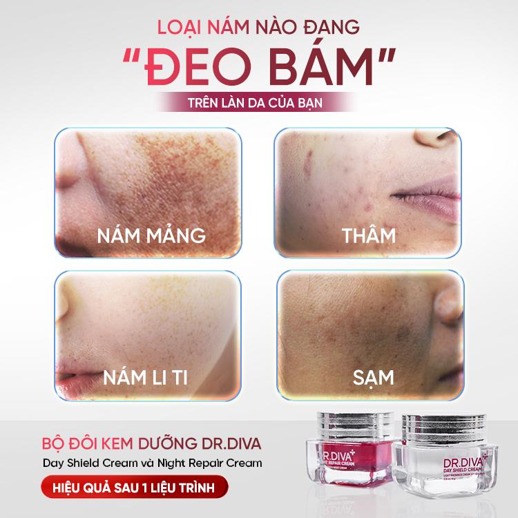 • Dr.Diva cung cấp giải pháp trị nám chuyên sâu, cam kết giảm đến 89% nám – thâm – sạm khi dùng liệu trình phù hợp ( thường dưới sự tư vấn chuyên gia).