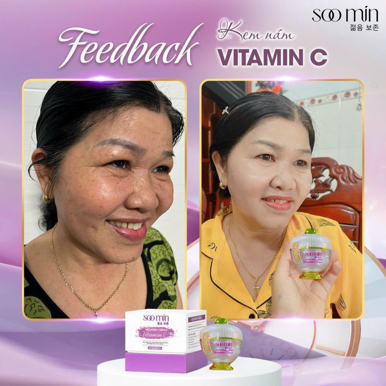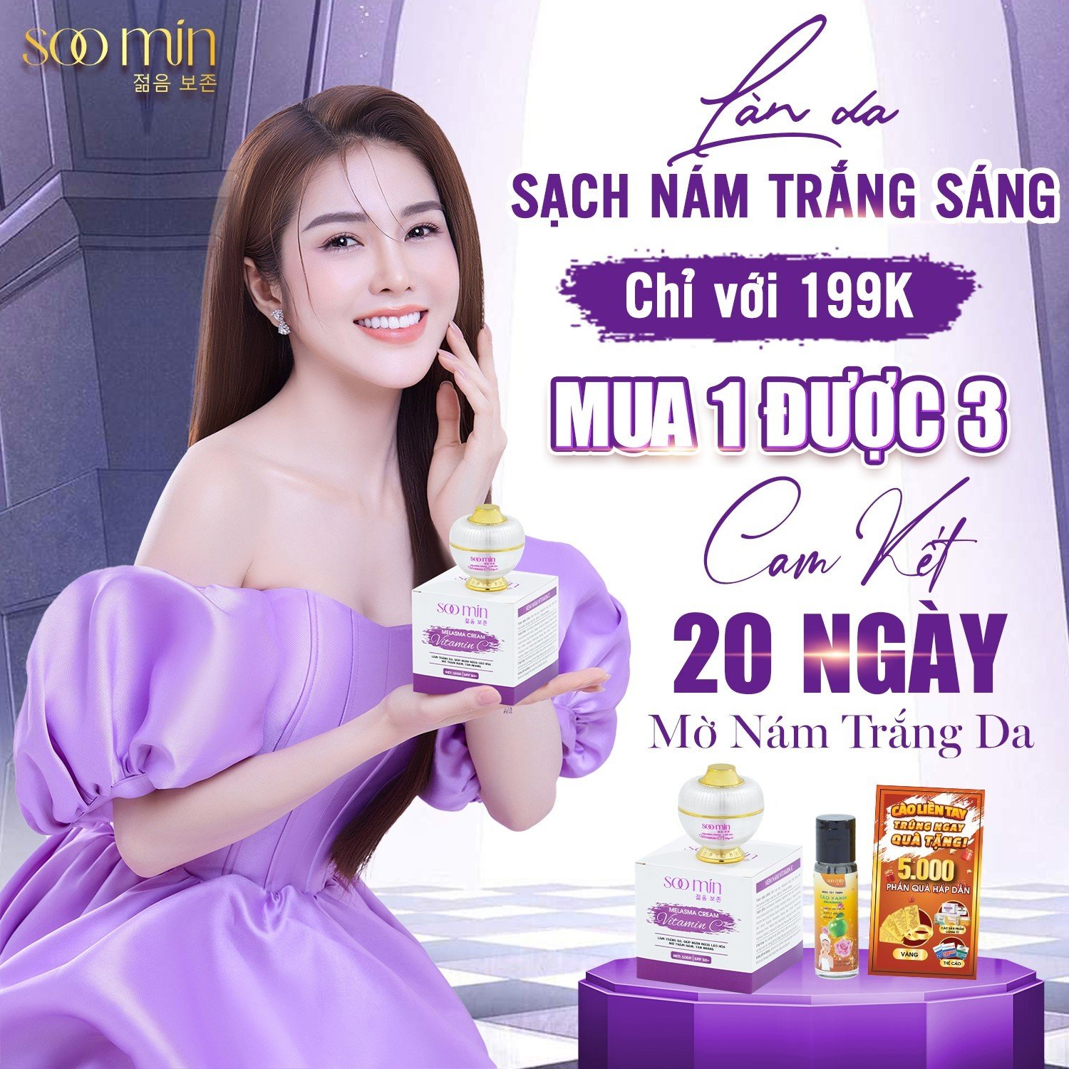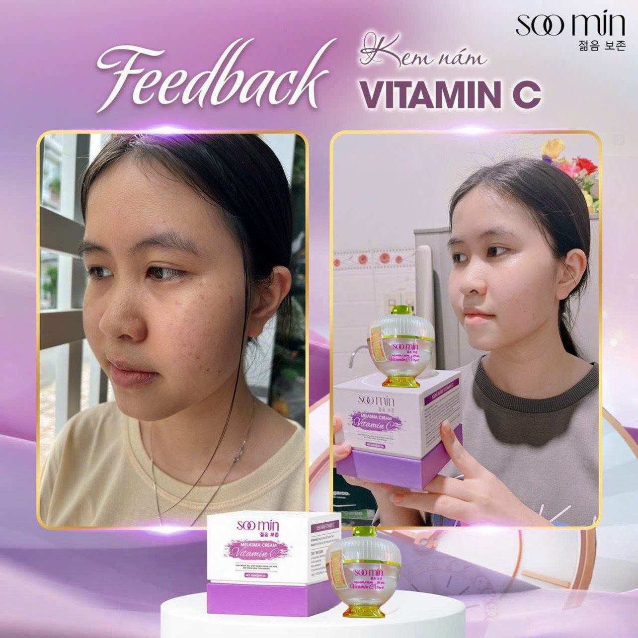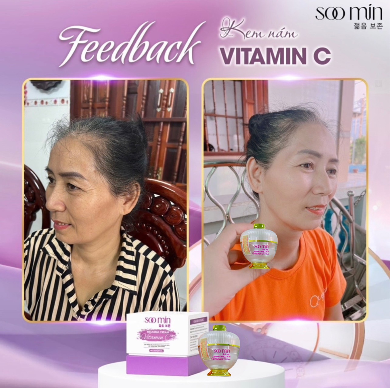 - Vitamin C trong Kem Face Nám Vitamin C Soo Min: Kích thích tổng hợp collagen, cải thiện mật độ da. Hoạt chất vàng trong việc dưỡng sáng, làm đều màu da và chống oxy hoá mạnh mẽ cho da khoẻ mạnh hơn. Tăng sức đề kháng, chống lại dấu hiệu lão hóa, giúp cho làn da khỏe mạnh từ bên trong. Đồng thời đẩy lùi sạm nám cho làn da trắng hồng rạng rỡ. Chống oxy hóa, thúc đẩy sản xuất collagen giúp da đàn hồi săn chắc, ngăn chặn hình thành Melanin.
