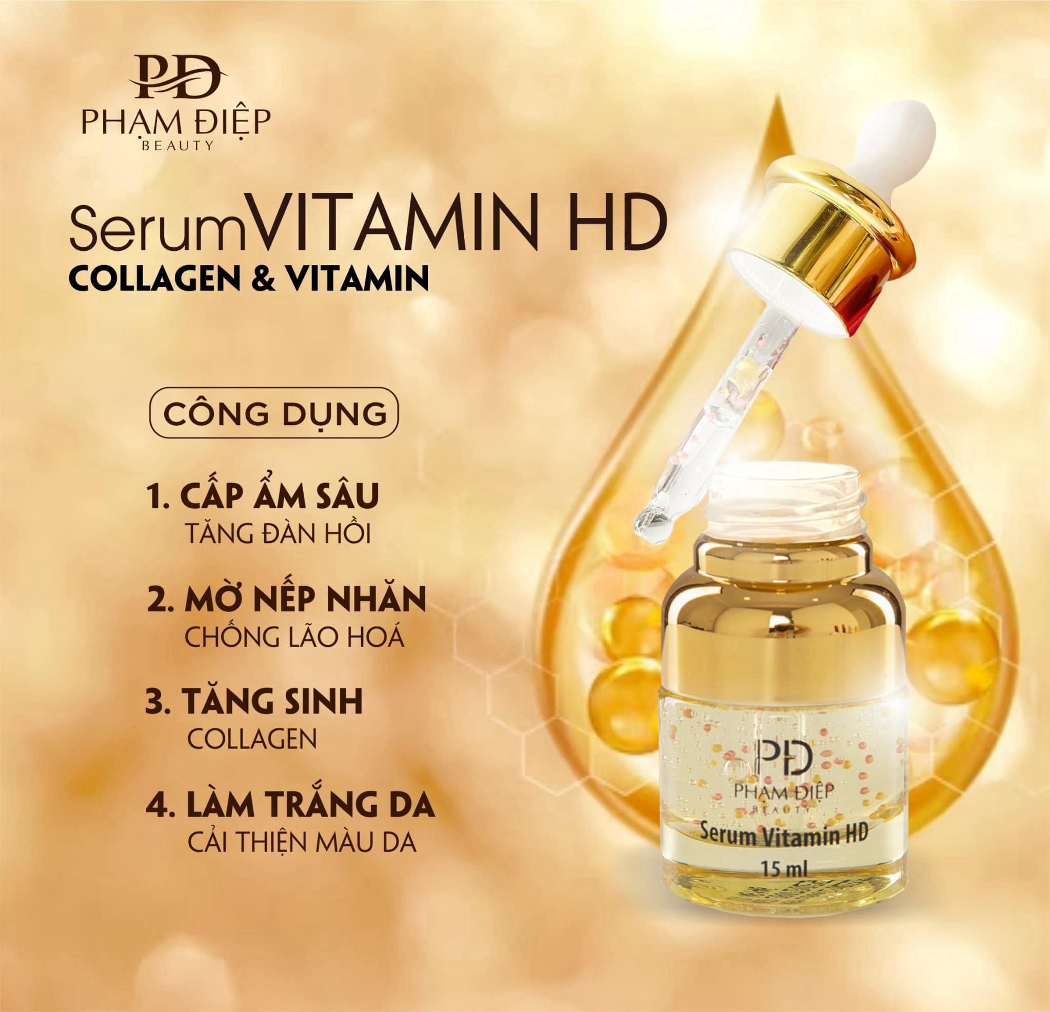 Serum Dưỡng Da Vitamin HD Phạm Điệp với chiết xuất từ Collagen tươi, tổng hợp các vitamin giúp dưỡng làn da trắng sáng, khỏe mạnh.