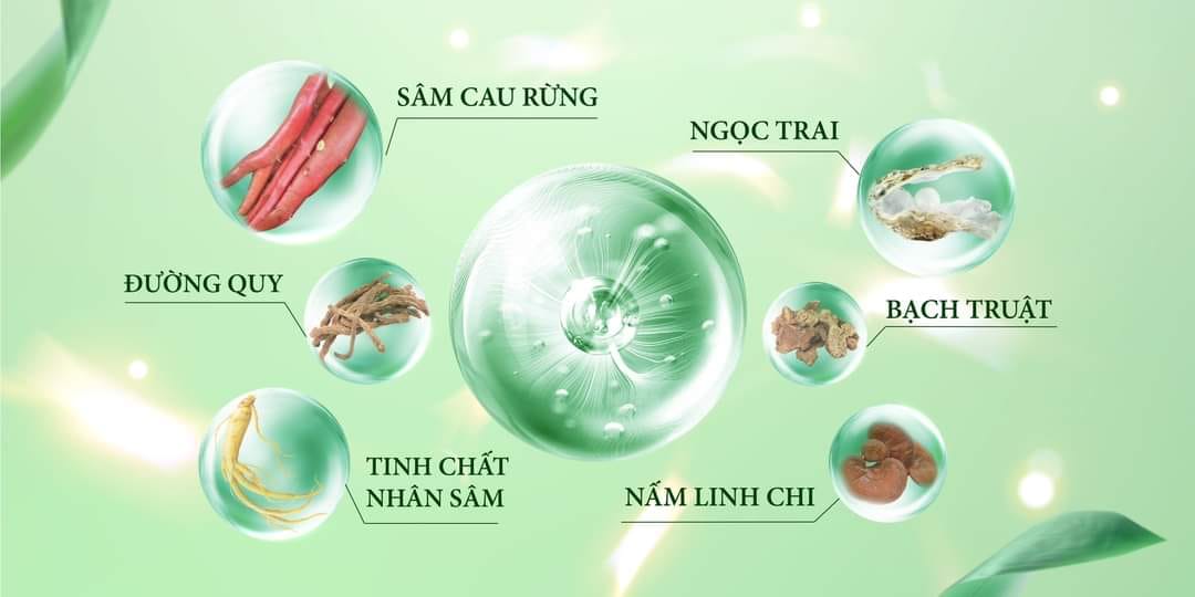 Thành phần Serum tái tạo da sâm cau rừng hoàn toàn từ thiên nhiên: Sâm cau rừng, đương quy, bạch truật, bột ngọc trai, chiết xuất nhân sâm, nấm linh chi.