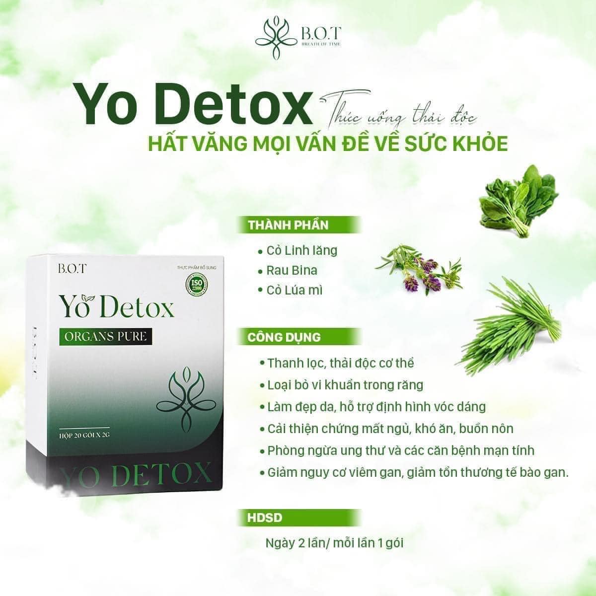 Yo Detox được chiết xuất từ những loại dược liệu giàu dược tính, dưới dạng cô đặc các phân tử diệp lục bào chế thành một siêu thực phẩm dành cho sức khoẻ với những công dụng vô cùng tuyệt vời: