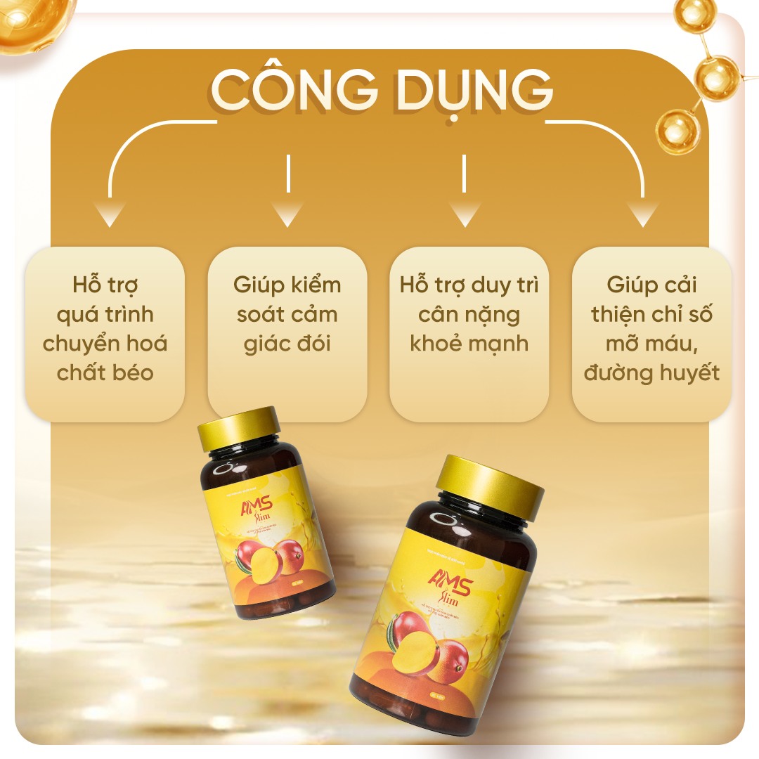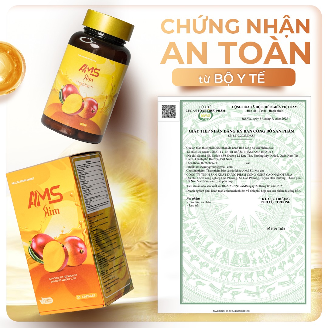 AMS Slim là thực phẩm bảo vệ sức khỏe được chiết xuất từ các thành phần thiên nhiên như hạt cà phê xanh, xoài châu Phi, bưởi, táo, kim ngân hoa…, giúp hỗ trợ chuyển hóa chất béo và hỗ trợ giảm béo an toàn.