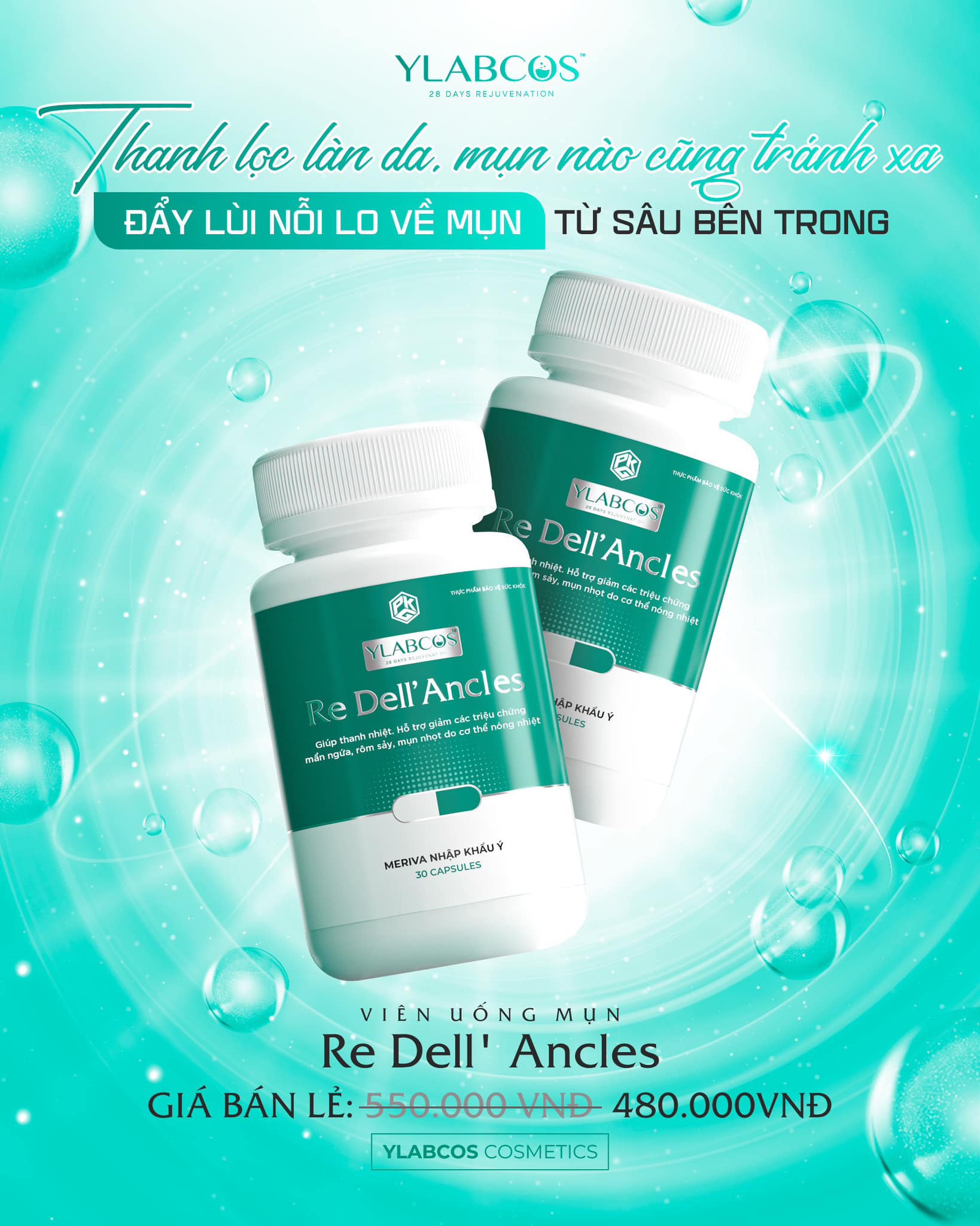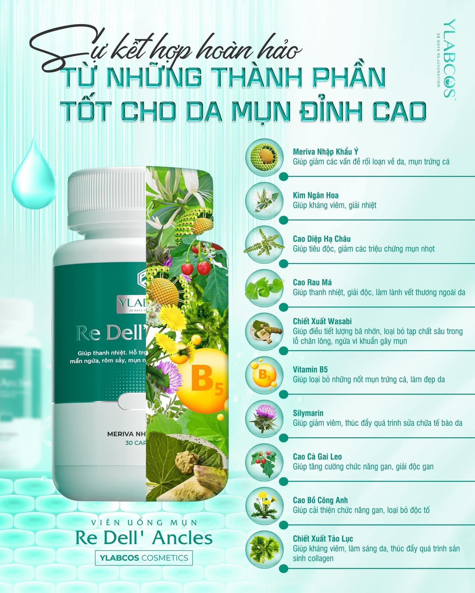Nhận biết được vấn đề của khách hàng thường xuyên bị mụn quay trở lại hay điều trị bằng nhiều phương pháp nhưng mụn không thuyên giảm Ylabcos ra mắt dòng sản phẩm Viên Uống Ngắt Mụn Re Dell Ancles Dr Lacir hỗ trợ điều trị, ngắt mụn từ bên trong và ngăn ngừa tái đi tái lại nhiều lần.