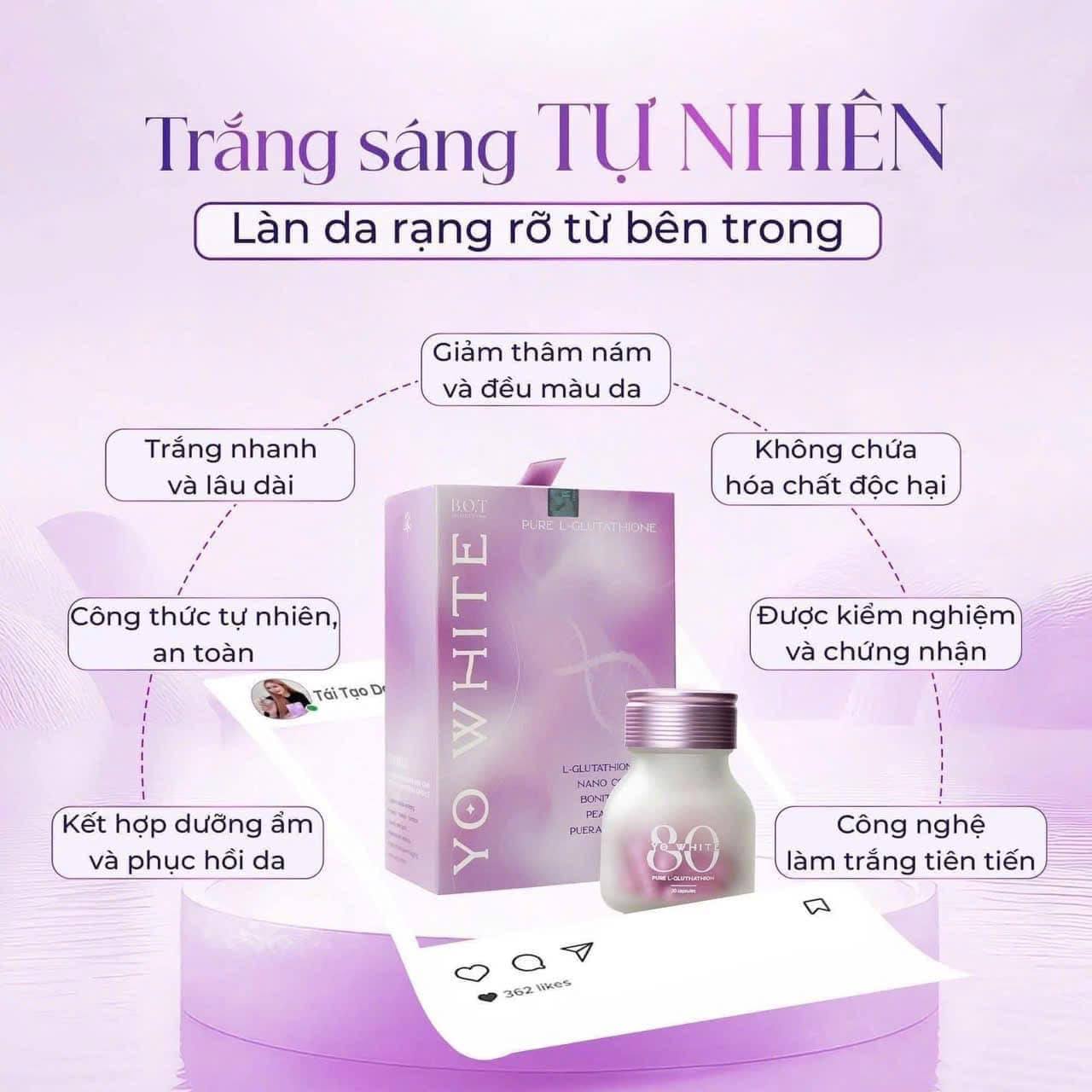 Nhờ cơ chế ức chế melanin và tăng cường tái tạo tế bào da, Yo White 80 đang được nhiều chị em lựa chọn để hỗ trợ dưỡng trắng toàn thân.